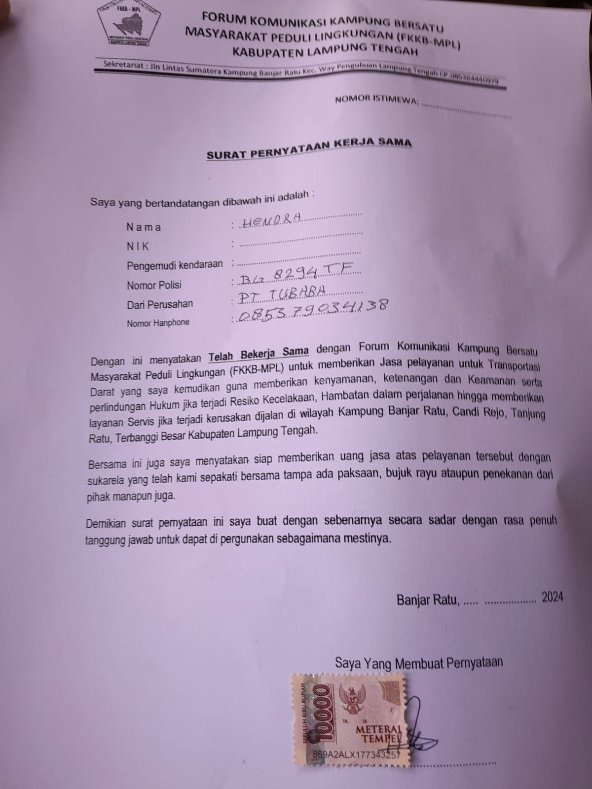 Forum Komunikasi Kampung Bersatu Masyarakat Peduli Lingkungan Lampung Tengah mengijinkan truk melintas jika sopir telah menandatangani surat pernyataan kerjasama di atas materai.