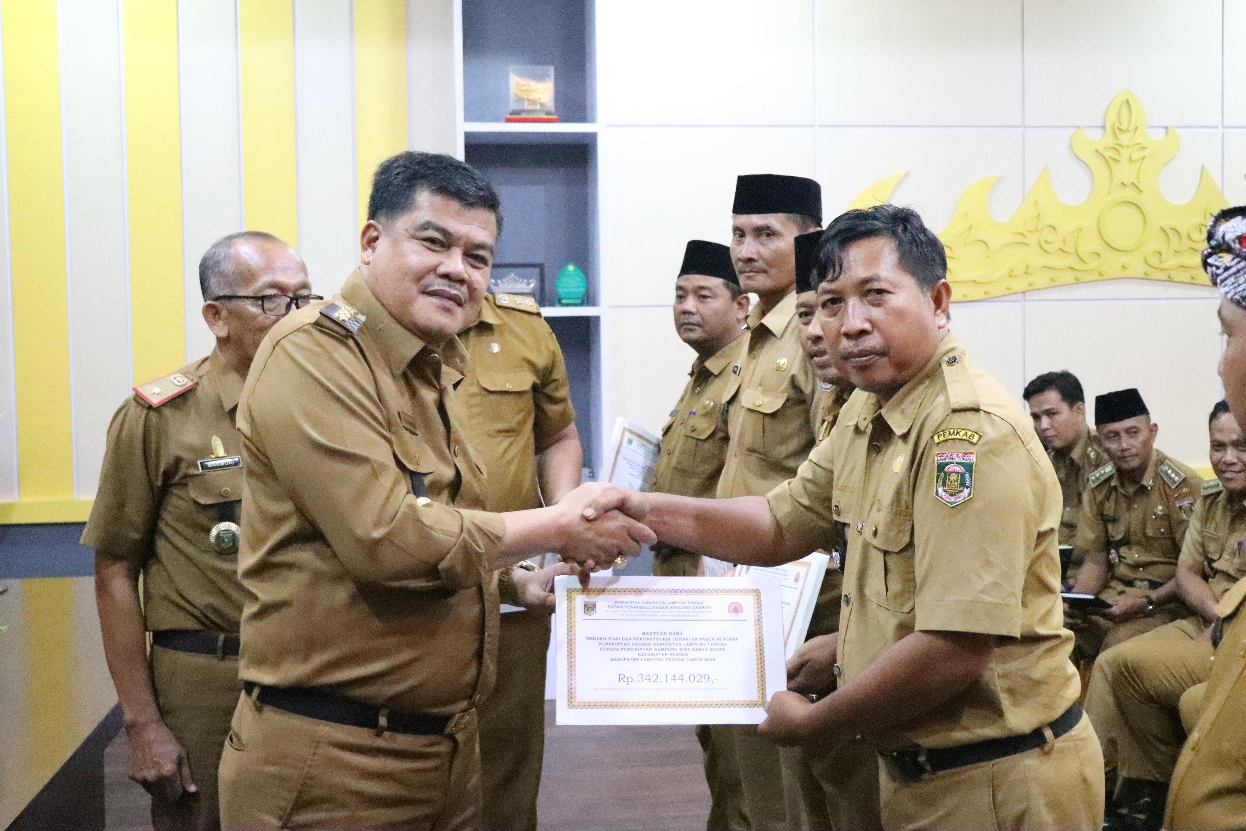 Bupati Lampung Tengah (Lamteng) Musa Ahmad menghadiri acara penyerahan bantuan kegiatan rehabilitasi dan rekontruksi jembatan/gorong-gorong pasca bencana Tahun Anggaran 2024 di ruang Subing, Senin (12/2/2024).