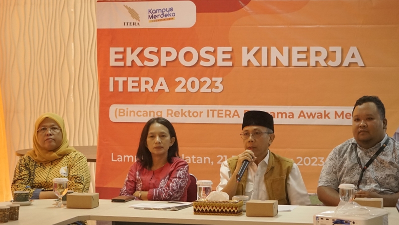 MITRA TV LAMPUNG.COM - LAMPUNG SELATAN. Rektor Institut Teknologi Sumatera (ITERA) Prof. Dr. I Nyoman Pugeg Aryantha, memaparkan berbagai inovasi riset yang dilakukan ITERA sepanjang tahun 2023 yang diharapkan dapat dirasakan manfaatnya oleh masyarakat, hingga pemberdayaan petani dan masyarakat di daerah. Hal tersebut disampaikan Rektor di hadapan puluhan jurnalis dalam Ekspose Kinerja ITERA Tahun 2023, dan Temu Awak Media, di Gedung C ITERA, Kamis, 21 Desember 2023. Turut hadir mendampingi rektor, Wakil Rektor Bidang Keuangan dan Umum Dr. Ir. Rahayu Sulistyorini, S.T.,M.T., Kepala Biro Perencanaan Umum dan Akademik drh. Sri Sulustiawati, M.M., dan Koordinator Kesekretariatan, Humas dan HTL Rahmattullah Harianja, S.T.Par., M.M.Par.