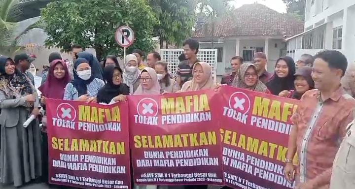Mereka membentangkan spanduk bertuliskan tolak mafia pendidikan dan selamatkan pendidikan dari mafia pendidikan.